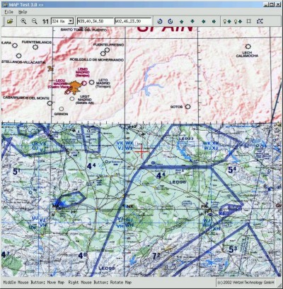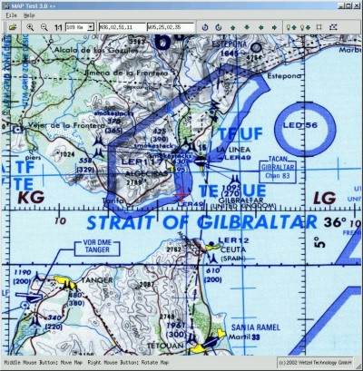 Wetzel Technology GmbH is developing digital map applications for the use in development, engineering and training simulators. Overlays allow to display an unlimited number of symbols like waypoints, routes, tactical overlays, navigation overlays etc. The pixmap data for map representation can be loaded by the user. A graphical user interface allows the easy asssignment of Map-pixel coordinates to Lat/Long coordinates. Additionally, a ARINC 424 reader allows to display different navigation charts. |